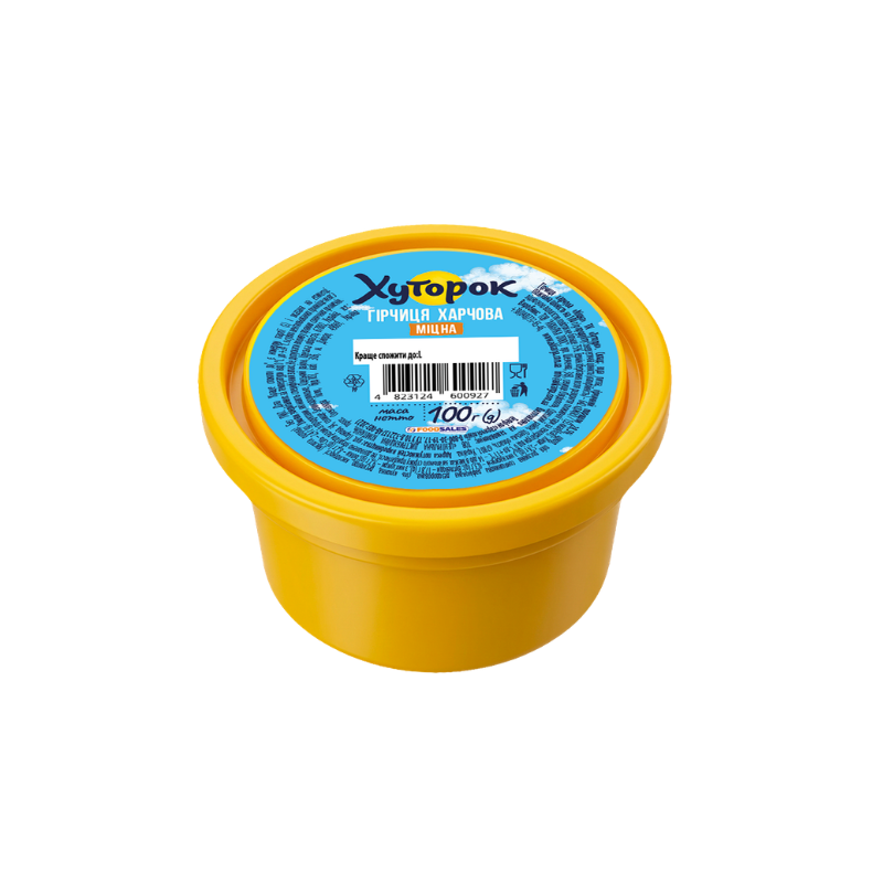 Склад: вода питна, зерно гірчиці жовтої – 24%, цукор білий кристалічний, сіль кухонна ґатунку «Екстра», регулятор кислотності - оцтова кислота, стабілізатор – камідь ксантанова, консервант – сорбат калію, куркума. Без ГМО. Не рекомендовано для вживання людям, що мають алергічні реакції на гірчицю.
